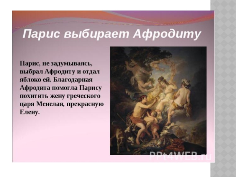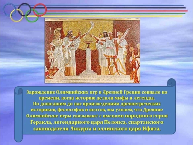 сказочный мир образов. Это могущественные боги: рассерженный Зевс и его всегда ревнивая супруга Гера, мудрая Афина Паллада и непреклонный Прометей, похитивший у богов огонь для людей. Это золотое яблоко, отданное принцем Парисом самой красивой богине, и последствия такого поступка – Троянская война. Это воспетые Гомером отважный Одисей, непревзойдённый по силе Геракл и легендарный Ахиллес с единственным уязвимым местом на теле – пяткой. Это мудрые Платон и Аристотель, гениальный математик и изобретатель Архимед, это, наконец, пришедшая из греции традиция проведения Олимпийских игр.