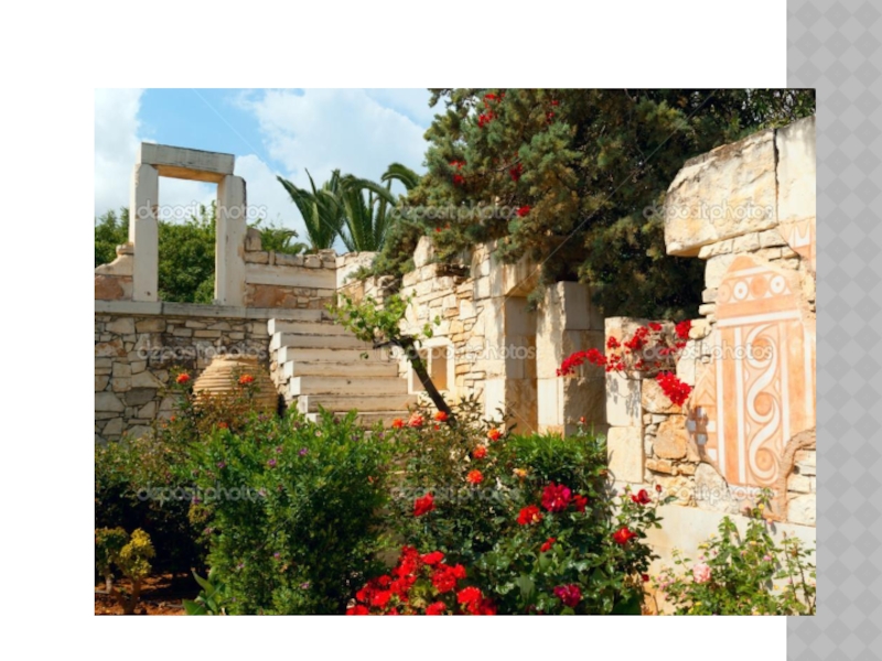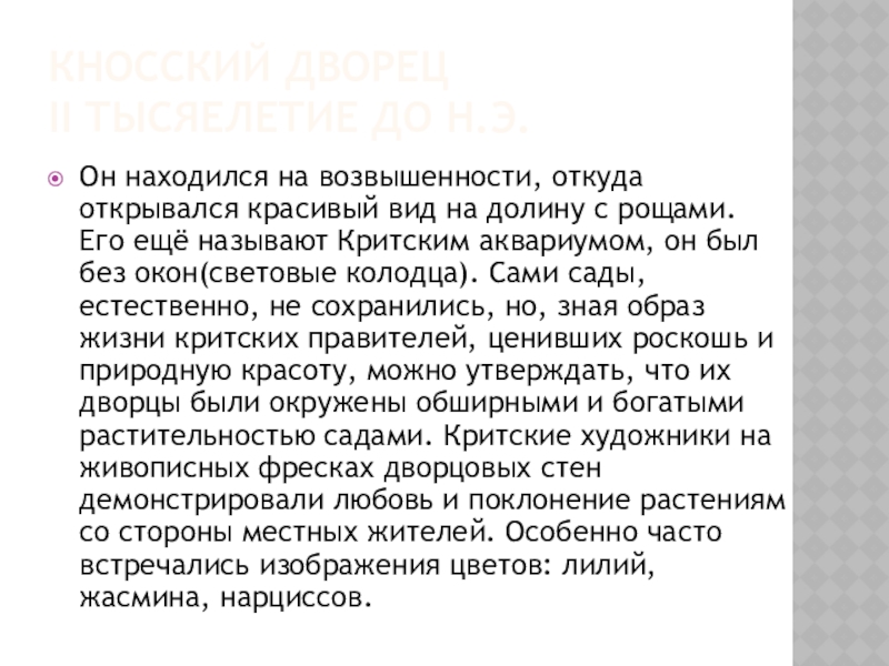 вид на долину с рощами. Его ещё называют Критским аквариумом, он был без окон(световые колодца). Сами сады, естественно, не сохранились, но, зная образ жизни критских правителей, ценивших роскошь и природную красоту, можно утверждать, что их дворцы были окружены обширными и богатыми растительностью садами. Критские художники на живописных фресках дворцовых стен демонстрировали любовь и поклонение растениям со стороны местных жителей. Особенно часто встречались изображения цветов: лилий, жасмина, нарциссов.