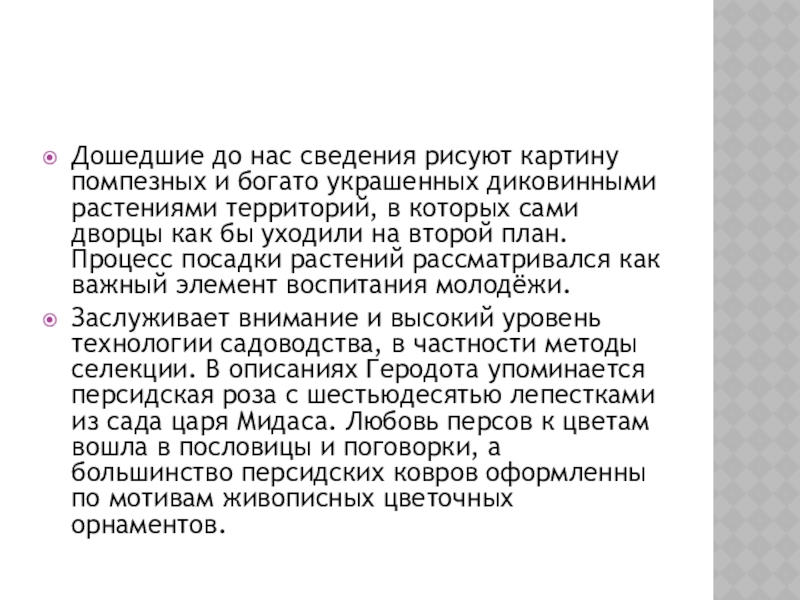 Заслуживает внимание и высокий уровень технологии садоводства, в частности методы селекции. В описаниях Геродота упоминается персидская роза с шестьюдесятью лепестками из сада царя Мидаса. Любовь персов к цветам вошла в пословицы и поговорки, а большинство персидских ковров оформленны по мотивам живописных цветочных орнаментов.