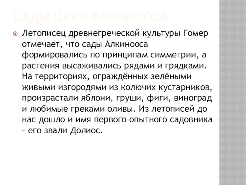 по принципам симметрии, а растения высаживались рядами и грядками. На территориях, ограждённых зелёными живыми изгородями из колючих кустарников, произрастали яблони, груши, фиги, виноград и любимые греками оливы. Из летописей до нас дошло и имя первого опытного садовника – его звали Долиос.