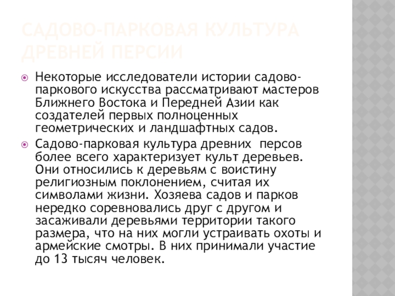 Садово-парковая культура древних персов более всего характеризует культ деревьев. Они относились к деревьям с воистину религиозным поклонением, считая их символами жизни. Хозяева садов и парков нередко соревновались друг с другом и засаживали деревьями территории такого размера, что на них могли устраивать охоты и армейские смотры. В них принимали участие до 13 тысяч человек.