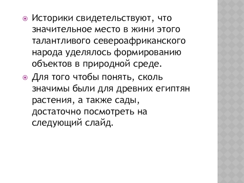 Для того чтобы понять, сколь значимы были для древних египтян растения, а также сады, достаточно посмотреть на следующий слайд.