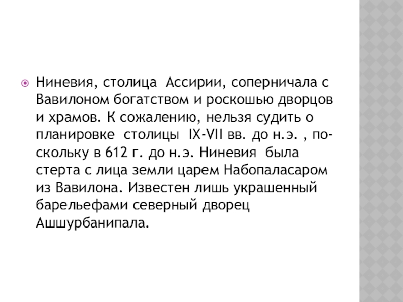 Слайд 32Ниневия, столица Ассирии, соперничала с Вавилоном богатством и роскошью дворцов и