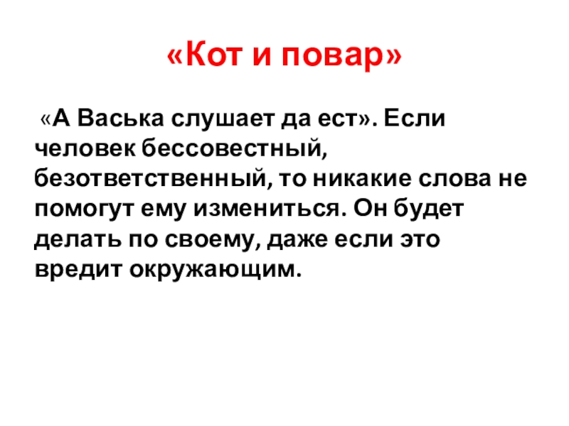 «Кот и повар»  «А Васька слушает да ест». Если человек бессовестный, безответственный, то никакие слова не