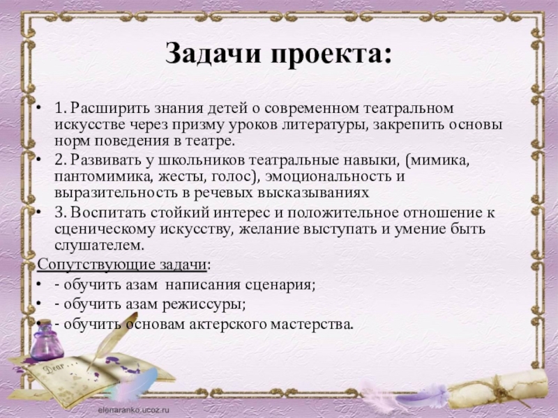 2. Развивать у школьников театральные навыки, (мимика, пантомимика, жесты, голос), эмоциональность и вырaзительность в речевых выскaзываниях
