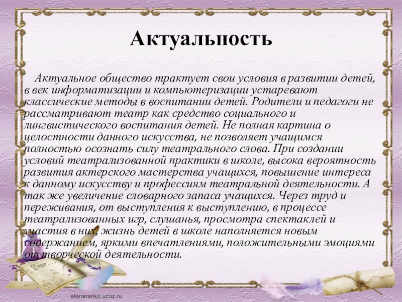 век информатизации и компьютеризации устаревают классические методы в воспитании детей. Родители и педагоги не рассматривают театр как средство социального и лингвистического воспитания детей. Не полная картина о целостности данного искусства, не позволяет учащимся полностью осознать силу театрального слова. При создании условий театрализованной практики в школе, высока вероятность развития актерского мастерства учащихся, повышение интереса к данному искусству и профессиям театральной деятельности. А так же увеличение словарного запаса учащихся. Через труд и переживания, от выступления к выступлению, в процессе театрализованных игр, слушанья, просмотра спектаклей и участия в них, жизнь детей в школе наполняется новым содержанием, яркими впечатлениями, положительными эмоциями от творческой деятельности.