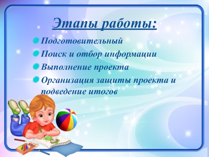 Этапы работы:ПодготовительныйПоиск и отбор информацииВыполнение проектаОрганизация защиты проекта и подведение итогов