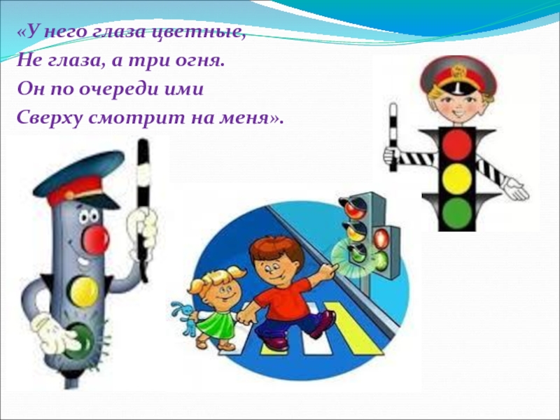 «У него глаза цветные,Не глаза, а три огня.Он по очереди ими Сверху смотрит на меня».