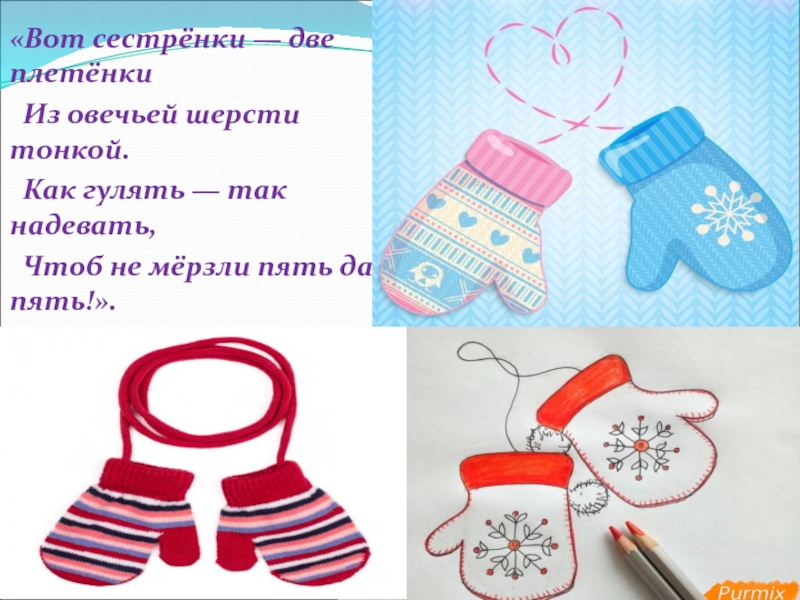 «Вот сестрёнки — две плетёнки Из овечьей шерсти тонкой. Как гулять — так надевать, Чтоб не мёрзли
