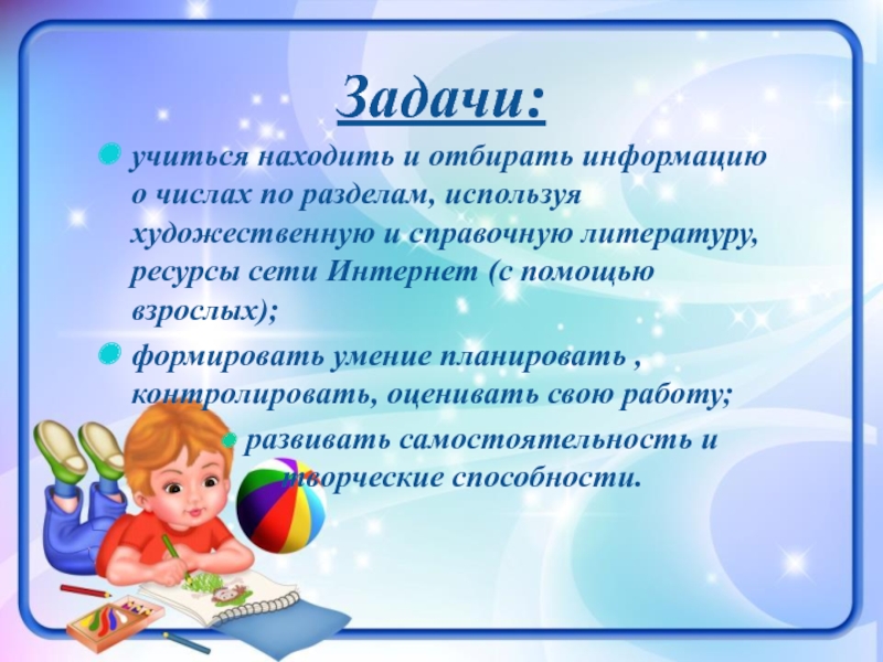 Задачи:учиться находить и отбирать информацию о числах по разделам, используя художественную и справочную литературу, ресурсы сети Интернет