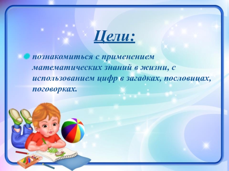 Цели:познакомиться с применением математических знаний в жизни, с использованием цифр в загадках, пословицах, поговорках.