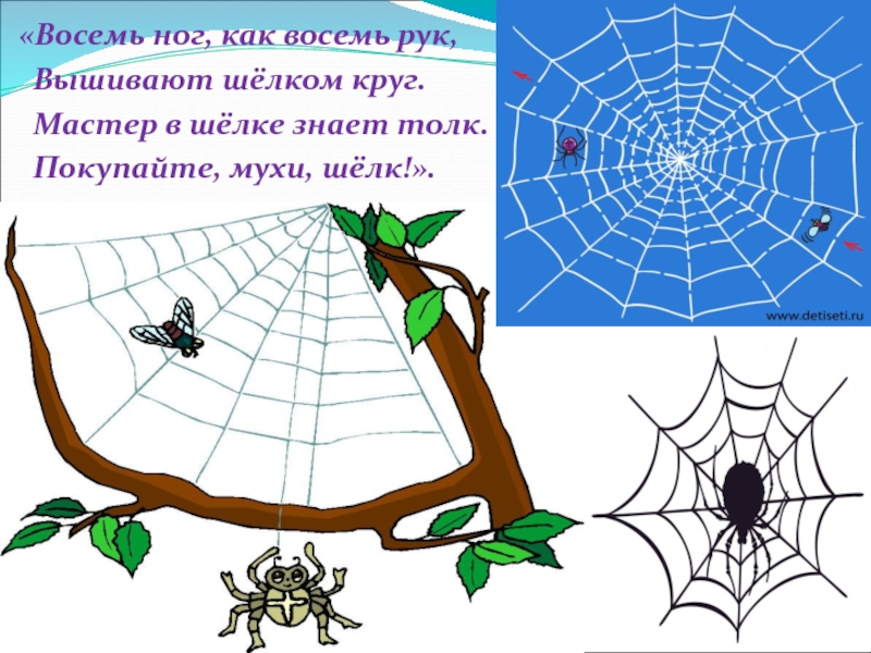 «Восемь ног, как восемь рук, Вышивают шёлком круг. Мастер в шёлке знает толк. Покупайте, мухи, шёлк!».