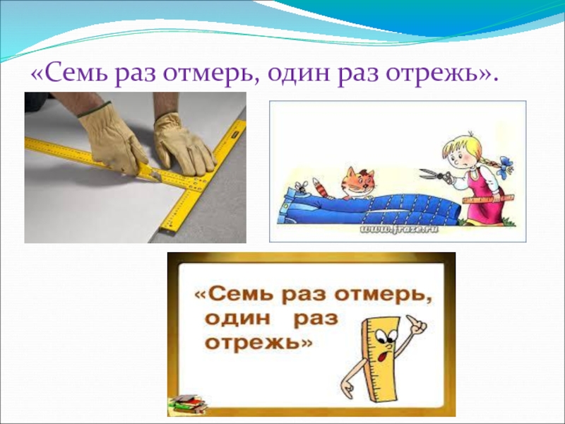 Слайд 14«Семь раз отмерь, один раз отрежь».