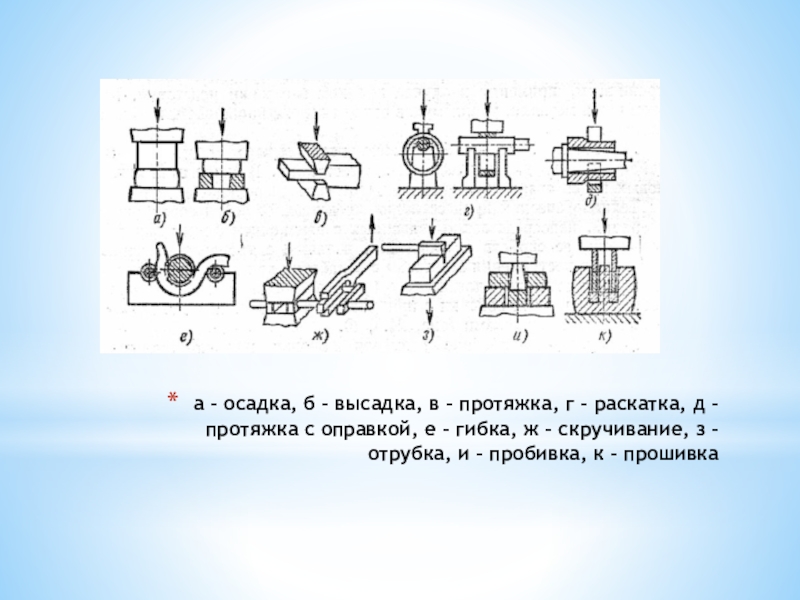 раскатка, д – протяжка с оправкой, е – гибка, ж – скручивание, з – отрубка, и – пробивка, к - прошивка