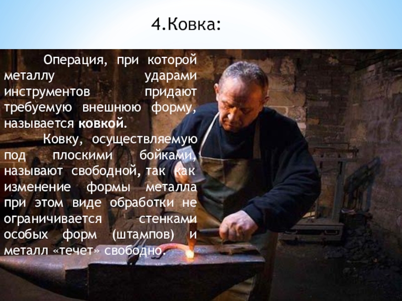 Ковку, осуществляемую под плоскими бойками, называют свободной, так как изменение формы металла при этом виде обработки не ограничивается стенками особых форм (штампов) и металл «течет» свободно.