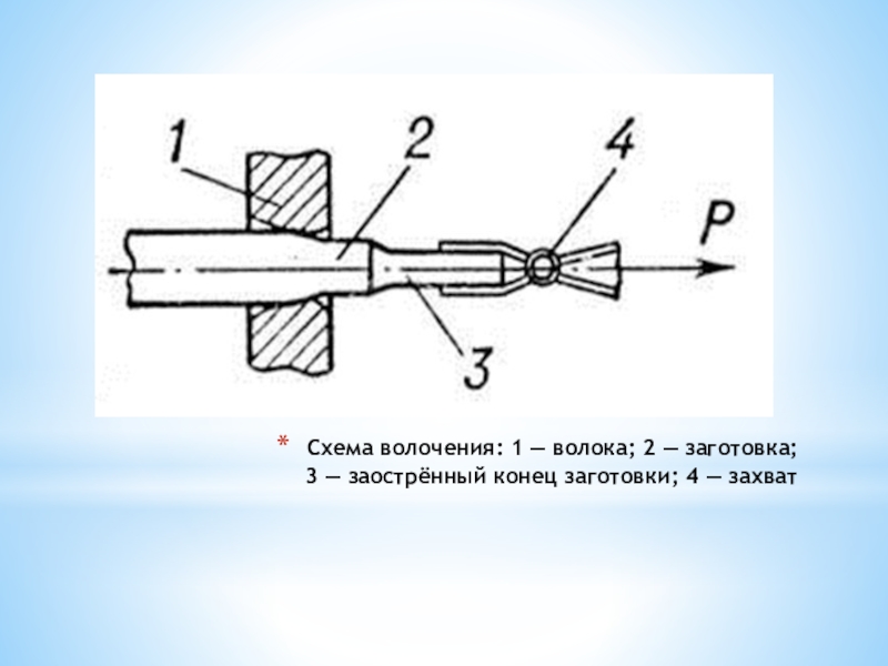 Слайд 7Схема волочения: 1 — волока; 2 — заготовка;