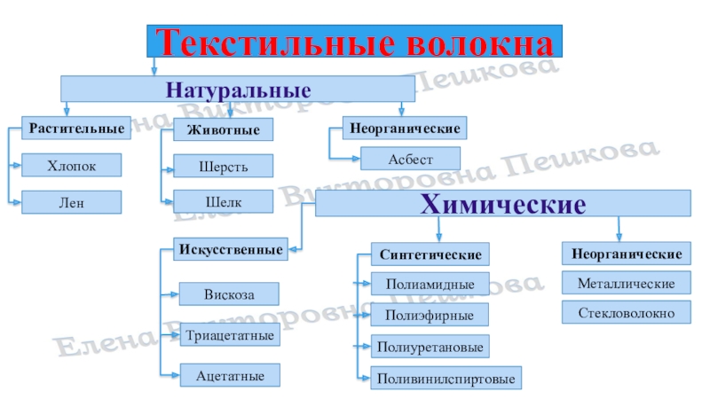 Текстильные волокнаНатуральныеЖивотныеНеорганическиеРастительныеХлопокЛенШерстьШелкАсбестХимическиеИскусственныеСинтетическиеНеорганическиеВискозаТриацетатныеАцетатныеПолиамидныеПолиэфирныеПолиуретановыеПоливинилспиртовыеМеталлическиеСтекловолокно