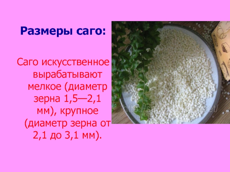 Саго искусственное вырабатывают мелкое (диаметр зерна 1,5—2,1 мм), крупное (диаметр