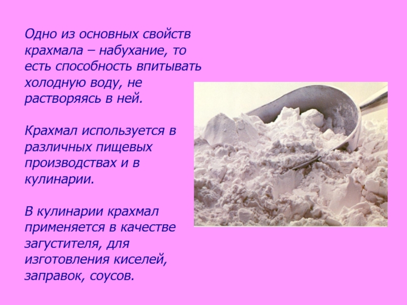 Слайд 4Одно из основных свойств крахмала – набухание, то есть способность впитывать