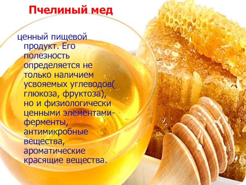 не только наличием усвояемых углеводов( глюкоза, фруктоза), но и физиологически ценными элементами- ферменты, антимикробные вещества, ароматические красящие вещества.