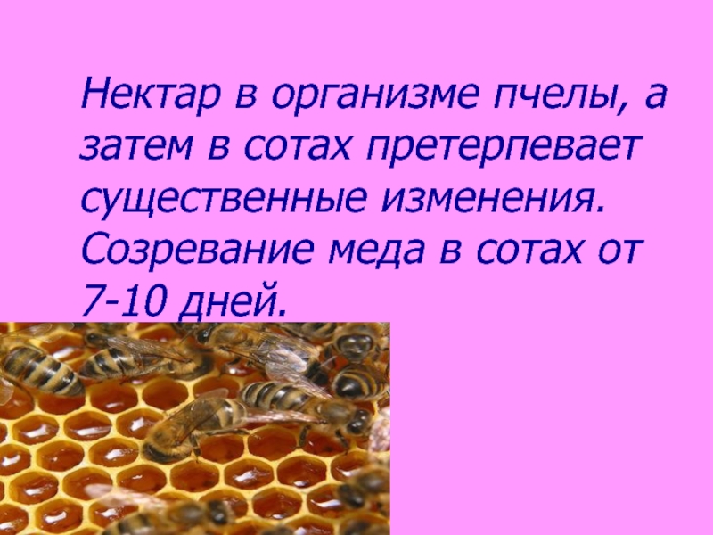 Слайд 24Нектар в организме пчелы, а затем в сотах претерпевает существенные изменения.
