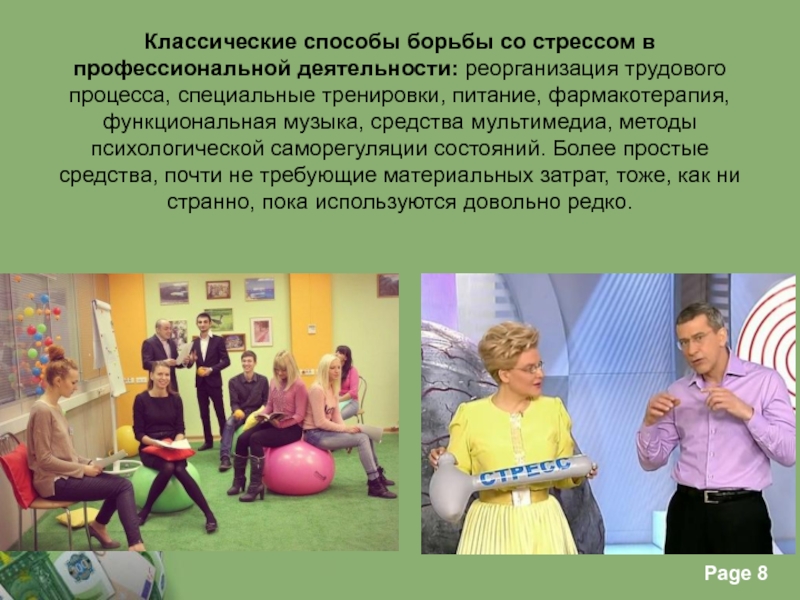 Слайд 8Классические способы борьбы со стрессом в профессиональной деятельности: реорганизация трудового процесса, специальные