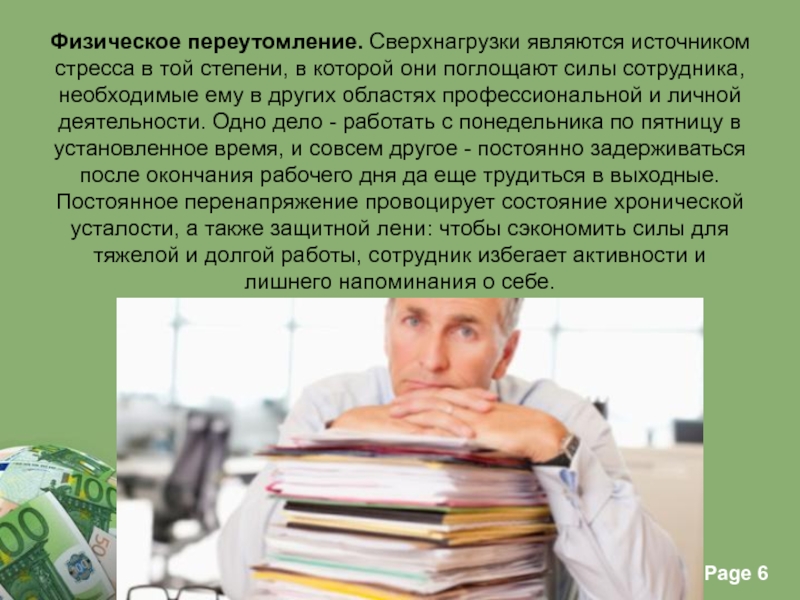 Слайд 6Физическое переутомление. Сверхнагрузки являются источником стресса в той степени, в которой они