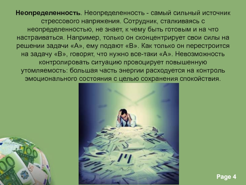 Слайд 4Неопределенность. Неопределенность - самый сильный источник стрессового напряжения. Сотрудник, сталкиваясь с