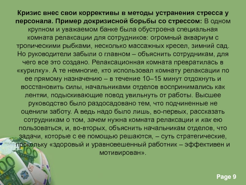 Слайд 9Кризис внес свои коррективы в методы устранения стресса у персонала. Пример