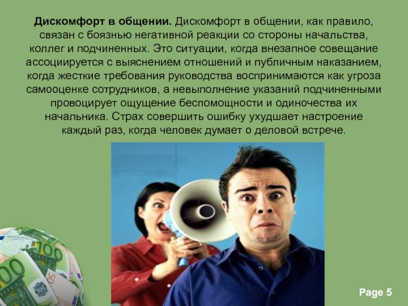 Слайд 5Дискомфорт в общении. Дискомфорт в общении, как правило, связан с боязнью негативной