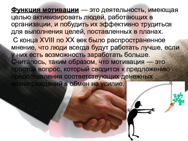 Слайд 8Функция мотивации — это деятельность, имеющая целью активизировать людей, работающих в организации,