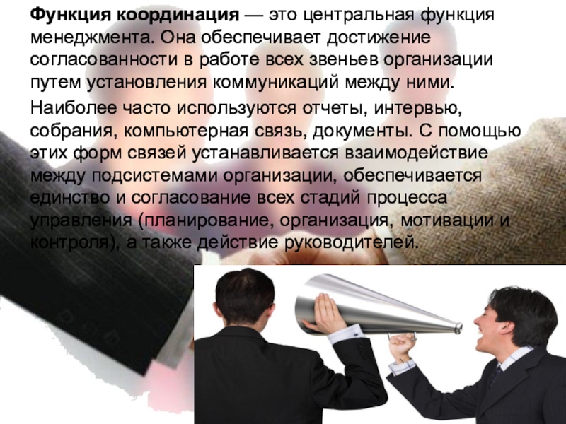 Слайд 10Функция координация — это центральная функция менеджмента. Она обеспечивает достижение согласованности в