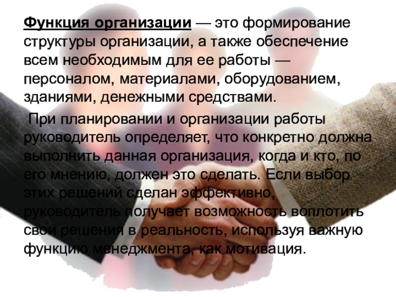 Слайд 7Функция организации — это формирование структуры организации, а также обеспечение всем необходимым