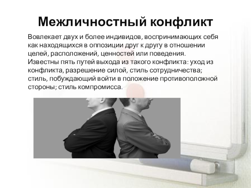 Известны пять путей выхода из такого конфликта: уход из конфликта, разрешение силой, стиль сотрудничества; стиль, побуждающий войти в положение противоположной стороны; стиль компромисса.