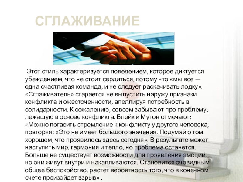 сердиться, потому что «мы все — одна счастливая команда, и не следует раскачивать лодку». «Сглаживатель» старается не выпустить наружу признаки конфликта и ожесточенности, апеллируя потребность в солидарности. К сожалению, совсем забывают про проблему, лежащую в основе конфликта. Блэйк и Мутон отмечают: «Можно погасить стремление к конфликту у другого человека, повторяя: «Это не имеет большого значения. Подумай о том хорошем, что проявилось здесь сегодня». В результате может наступить мир, гармония и тепло, но проблема останется. Больше не существует возможности для проявления эмоций, но они живут внутри и накапливаются. Становится очевидным общее беспокойство, растет вероятность того, что в конечном счете произойдет взрыв» .