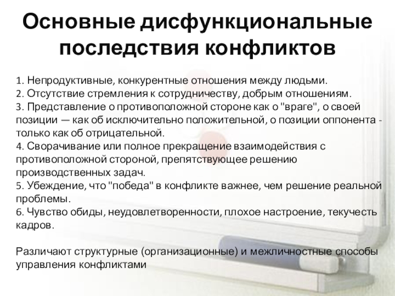 Слайд 12Основные дисфункциональные последствия конфликтов
