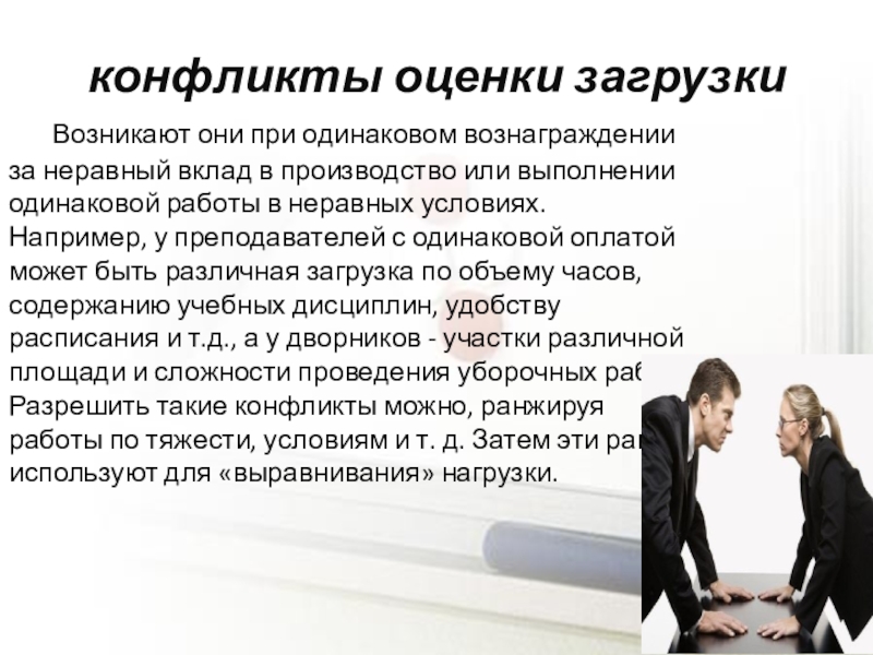 производство или выполнении одинаковой работы в неравных условиях. Например, у преподавателей с одинаковой оплатой может быть различная загрузка по объему часов, содержанию учебных дисциплин, удобству расписания и т.д., а у дворников - участки различной площади и сложности проведения уборочных работ. Разрешить такие конфликты можно, ранжируя работы по тяжести, условиям и т. д. Затем эти ранги используют для «выравнивания» нагрузки.