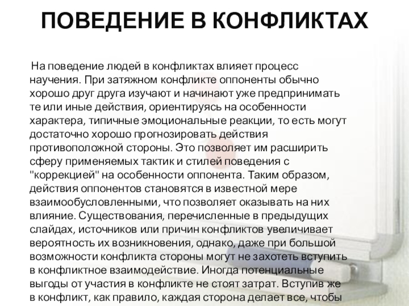 При затяжном конфликте оппоненты обычно хорошо друг друга изучают и начинают уже предпринимать те или иные действия, ориентируясь на особенности характера, типичные эмоциональные реакции, то есть могут достаточно хорошо прогнозировать действия противоположной стороны. Это позволяет им расширить сферу применяемых тактик и стилей поведения с "коррекцией" на особенности оппонента. Таким образом, действия оппонентов становятся в известной мере взаимообусловленными, что позволяет оказывать на них влияние. Существования, перечисленные в предыдущих слайдах, источников или причин конфликтов увеличивает вероятность их возникновения, однако, даже при большой возможности конфликта стороны могут не захотеть вступить в конфликтное взаимодействие. Иногда потенциальные выгоды от участия в конфликте не стоят затрат. Вступив же в конфликт, как правило, каждая сторона делает все, чтобы была принята ее точка зрения.