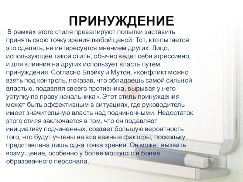 зрения любой ценой. Тот, кто пытается это сделать, не интересуется мнением других. Лицо, использующее такой стиль, обычно ведет себя агрессивно, и для влияния на других использует власть путем принуждения. Согласно Блэйку и Мутон, «конфликт можно взять под контроль, показав, что обладаешь самой сильной властью, подавляя своего противника, вырывая у него уступку по праву начальника». Этот стиль принуждения может быть эффективным в ситуациях, где руководитель имеет значительную власть над подчиненными. Недостаток этого стиля заключается в том, что он подавляет инициативу подчиненных, создает большую вероятность того, что будут учтены не все важные факторы, поскольку представлена лишь одна точка зрения. Он может вызвать возмущение, особенно у более молодого и более образованного персонала.