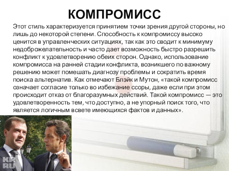 некоторой степени. Способность к компромиссу высоко ценится в управленческих ситуациях, так как это сводит к минимуму недоброжелательность и часто дает возможность быстро разрешить конфликт к удовлетворению обеих сторон. Однако, использование компромисса на ранней стадии конфликта, возникшего по важному решению может помешать диагнозу проблемы и сократить время поиска альтернатив. Как отмечают Блэйк и Мутон, «такой компромисс означает согласие только во избежание ссоры, даже если при этом происходит отказ от благоразумных действий. Такой компромисс — это удовлетворенность тем, что доступно, а не упорный поиск того, что является логичным всвете имеющихся фактов и данных».