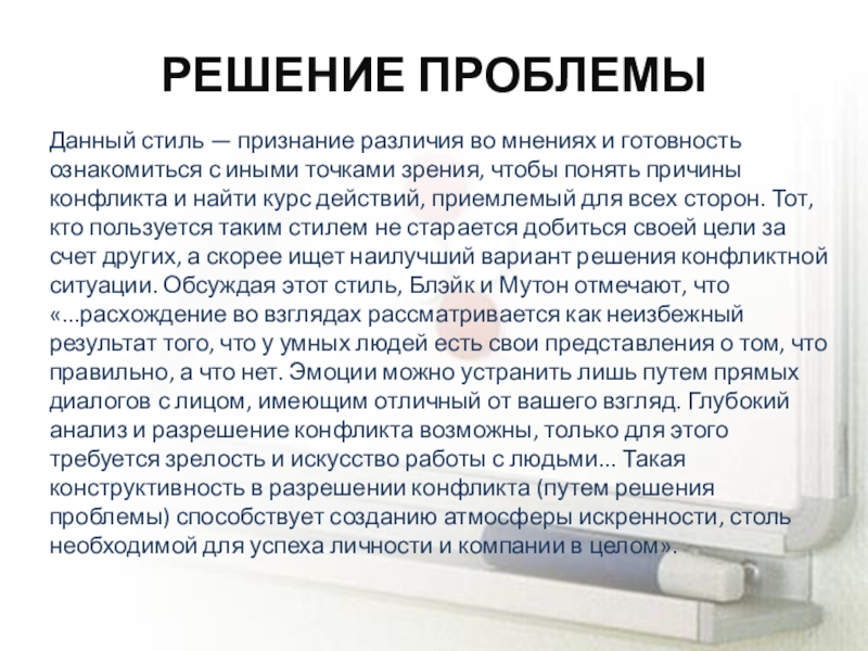 с иными точками зрения, чтобы понять причины конфликта и найти курс действий, приемлемый для всех сторон. Тот, кто пользуется таким стилем не старается добиться своей цели за счет других, а скорее ищет наилучший вариант решения конфликтной ситуации. Обсуждая этот стиль, Блэйк и Мутон отмечают, что