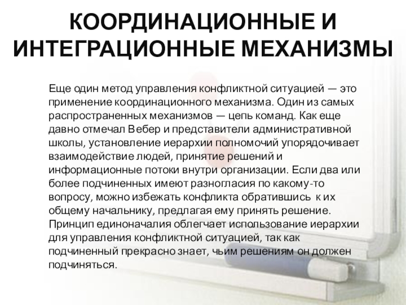 применение координационного механизма. Один из самых распространенных механизмов — цепь команд. Как еще давно отмечал Вебер и представители административной школы, установление иерархии полномочий упорядочивает взаимодействие людей, принятие решений и информационные потоки внутри организации. Если два или более подчиненных имеют разногласия по какому-то вопросу, можно избежать конфликта обратившись к их общему начальнику, предлагая ему принять решение. Принцип единоначалия облегчает использование иерархии для управления конфликтной ситуацией, так как подчиненный прекрасно знает, чьим решениям он должен подчиняться.