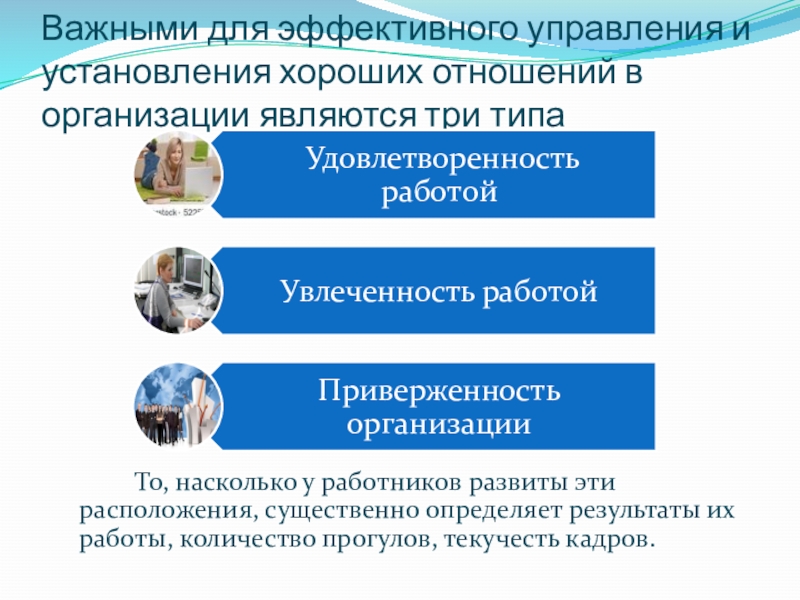 То, насколько у работников развиты эти расположения, существенно определяет результаты их работы, количество прогулов, текучесть кадров.