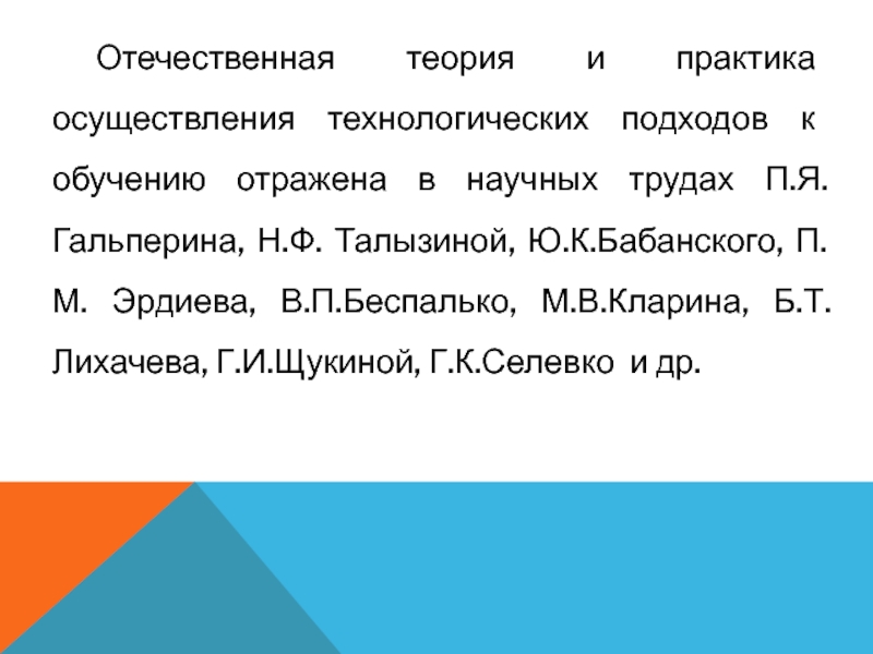 Слайд 4Отечественная теория и практика осуществления технологических подходов к обучению отражена в