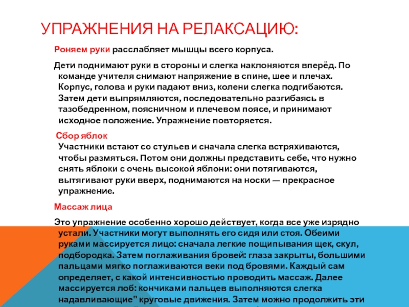 УПРАЖНЕНИЯ НА РЕЛАКСАЦИЮ: