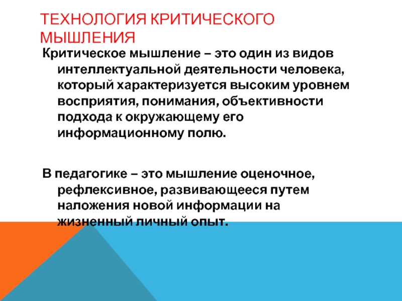 В педагогике – это мышление оценочное, рефлексивное, развивающееся путем наложения новой информации на жизненный личный опыт.