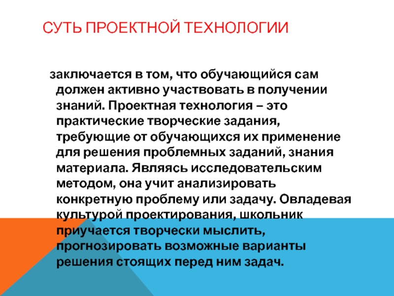 Слайд 12 СУТЬ ПРОЕКТНОЙ ТЕХНОЛОГИИ