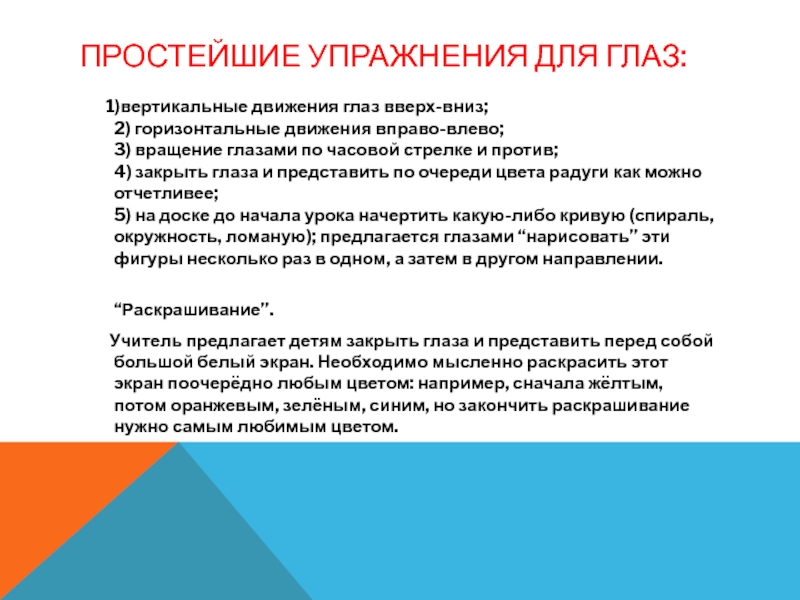 Слайд 9ПРОСТЕЙШИЕ УПРАЖНЕНИЯ ДЛЯ ГЛАЗ: