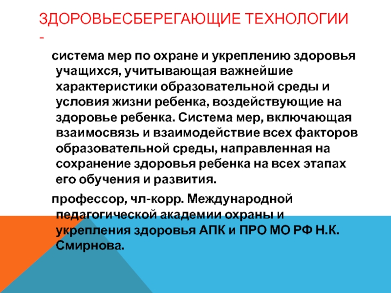 профессор, чл-корр. Международной педагогической академии охраны и укрепления здоровья АПК и ПРО МО РФ Н.К. Смирнова.