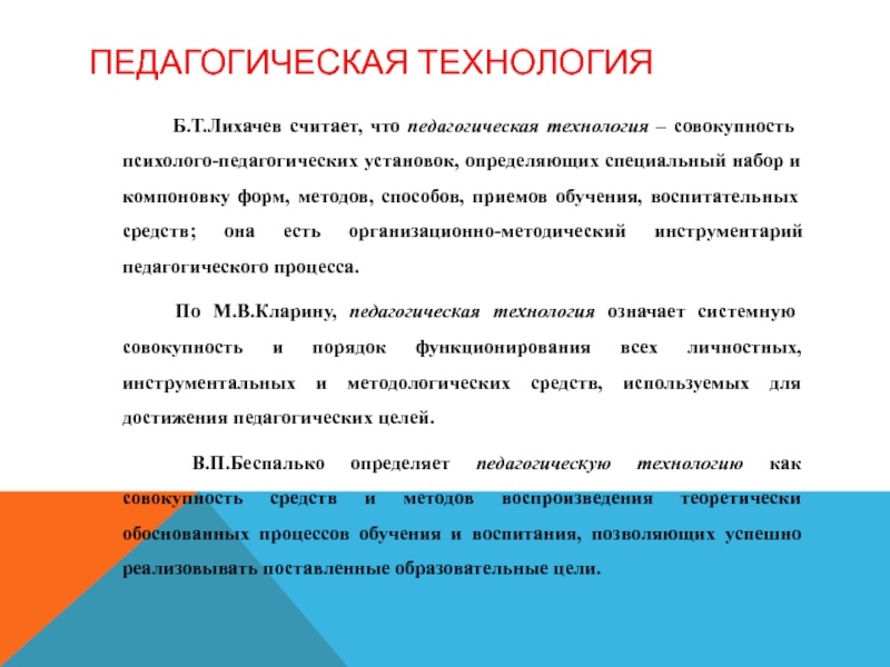 Б.Т.Лихачев считает, что педагогическая технология – совокупность психолого-педагогических установок,